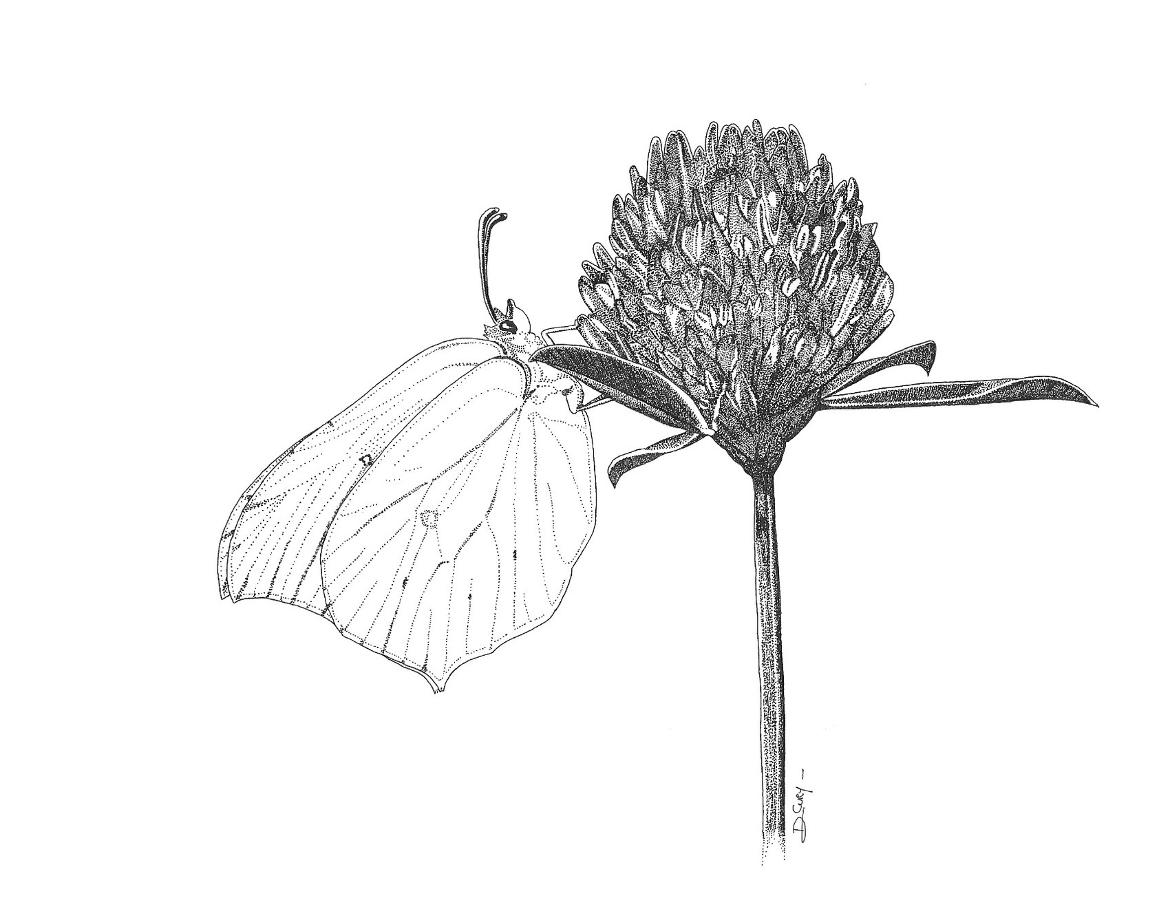 Citron butinant un trèfle, une image printanière ! Encre de chine sur feuille A4