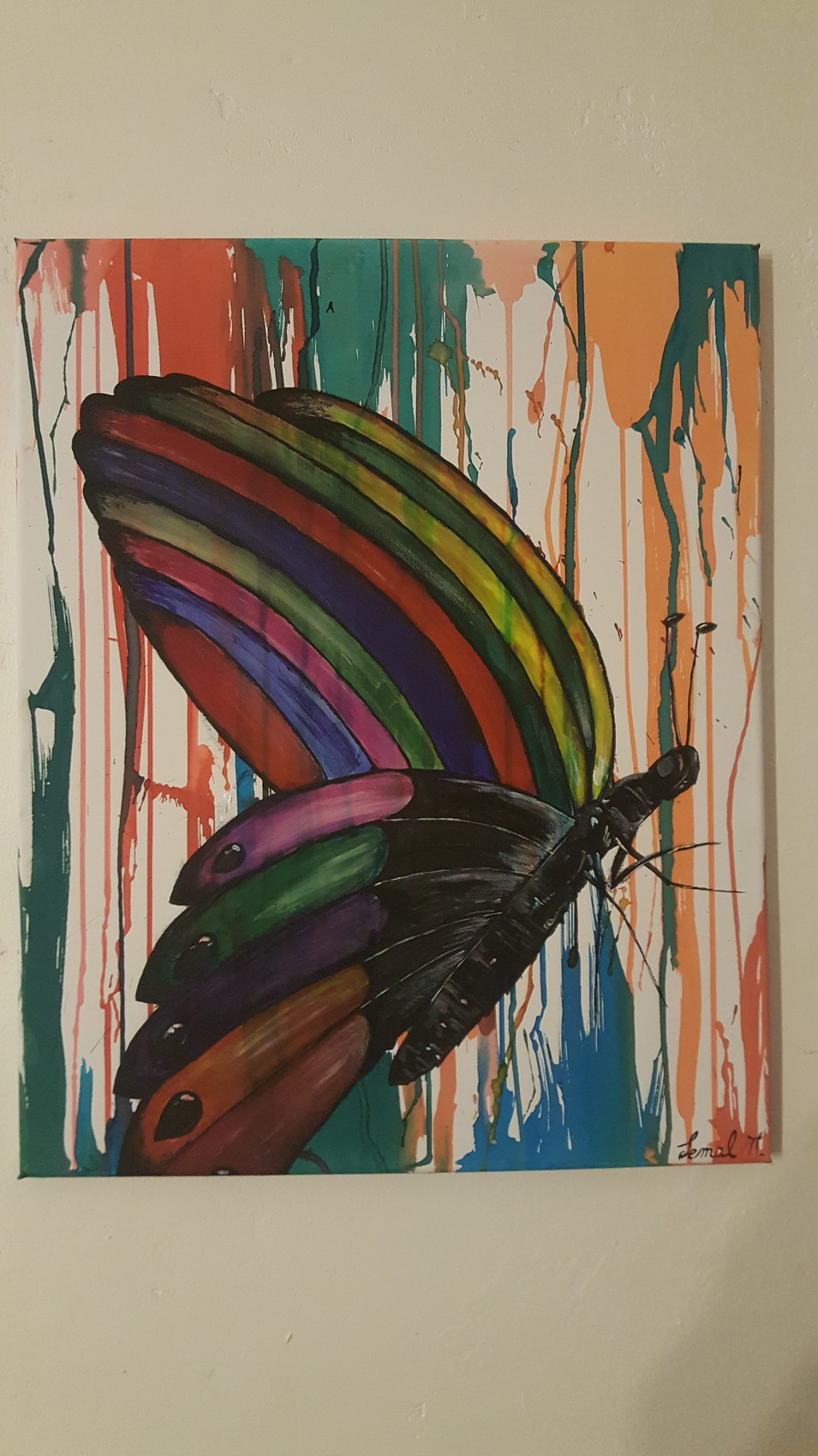 Peinture mixte, eau et acrylique Papillon sue toile, 40*50cm