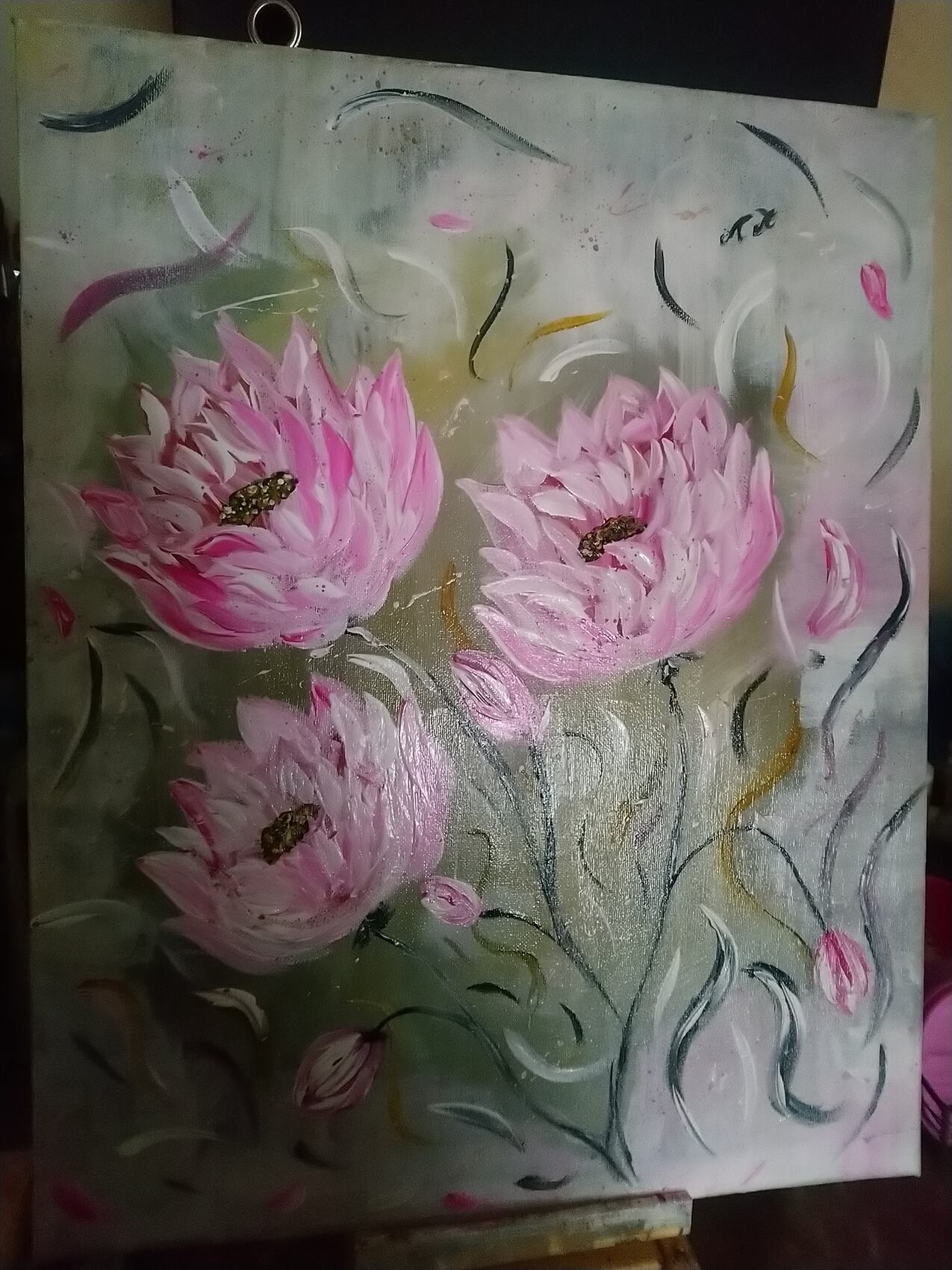 tableau réalisé en peintures acrylique, fleurs de lotus , toile 40x50 cm::