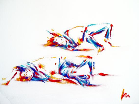 Croquis de danseurs au pastel de couleurs bleu, jaune, rouge. Mouvement de personnage.