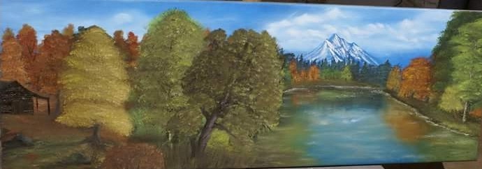Peinture a huile sur toile coton sur châssis bois . Dimension 30x60cm. Technique utilisée couteau,pinceau et main. Paysage automne . Montagne,rivière.