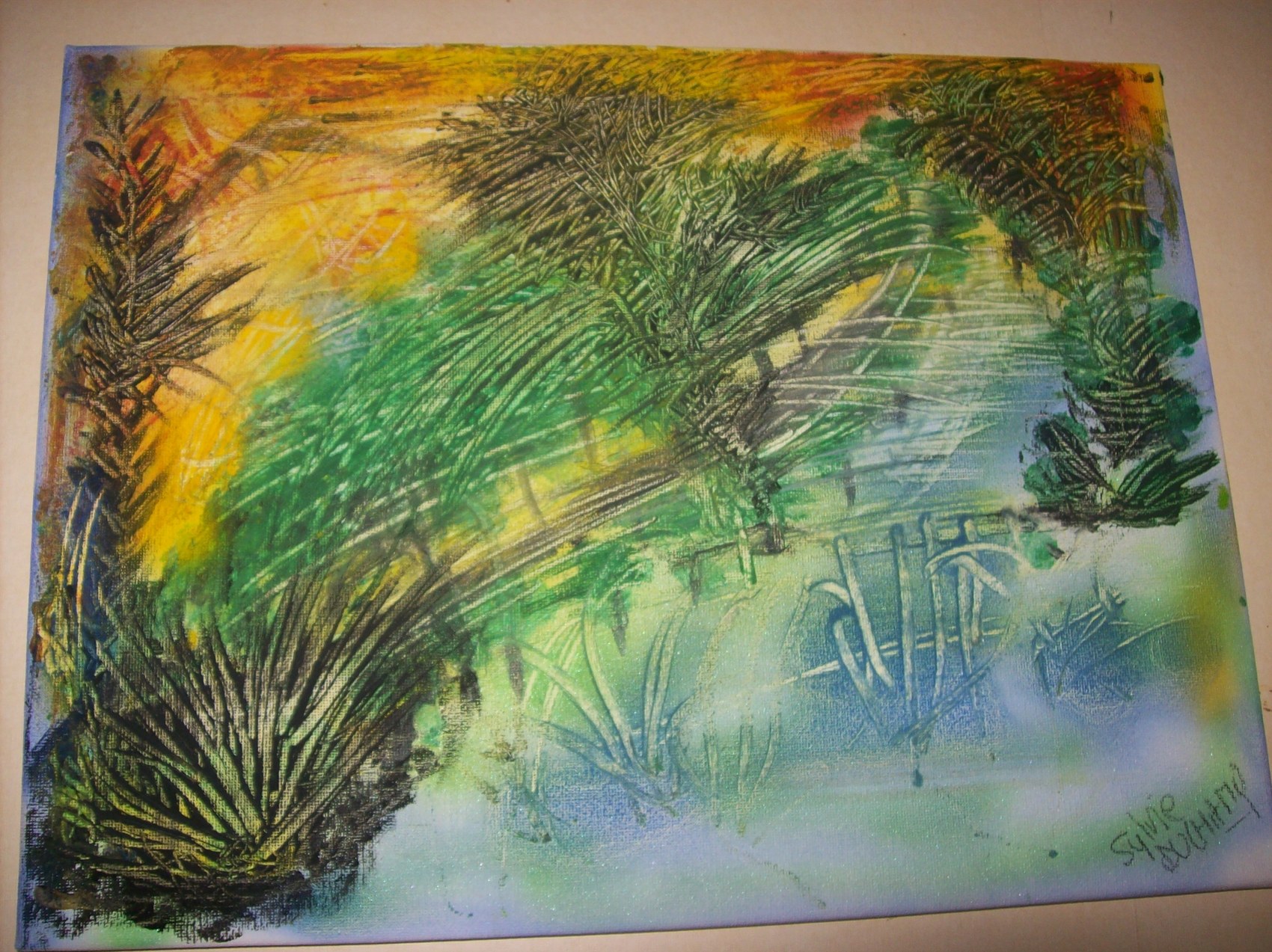 Paysage peinture acrylique, grattoir....