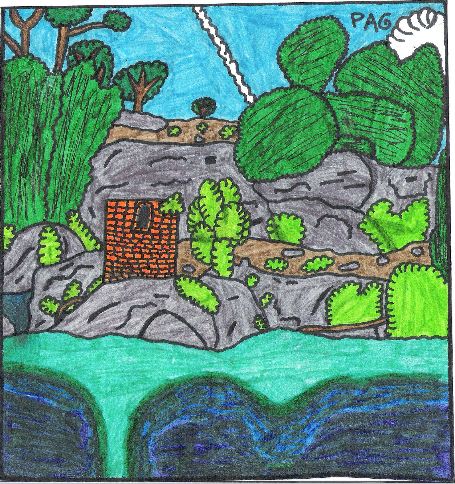 Série de petites œuvres de différents genres représentant différents paysages provençaux. Ici, dessin aux feutres de couleur sur du papier carton fin arraché et coupé grossièrement. Dimensions : environ 20 x 22 cm. Paysages Provençaux vol.20 - Face A :"Le bord de lac".