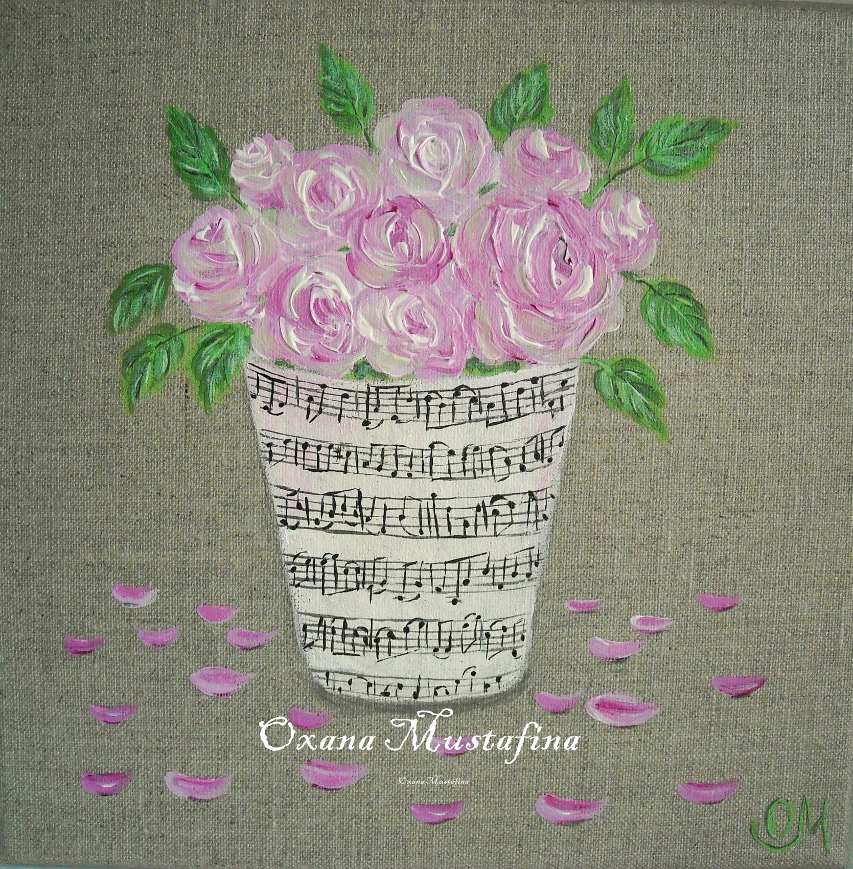 Peinture acrylique "Poésie rose" dans le style Shabby sur toile de lin 100 %. La poésie des roses et de la musique. Les dimensions du tableau: 20 * 20 * 1,5 cm. Prêt à accrocher.
