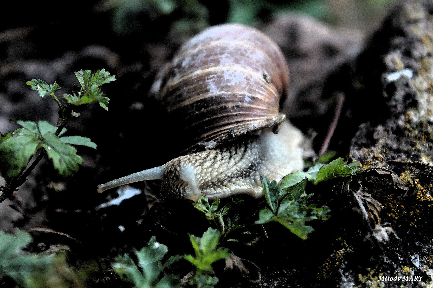 Cette photographie représente un petit escargot, entrain de poursuivre sa petite course. Pour ce battre dans sa petite vie et pouvoir se réfugier dans sa maison mobile.