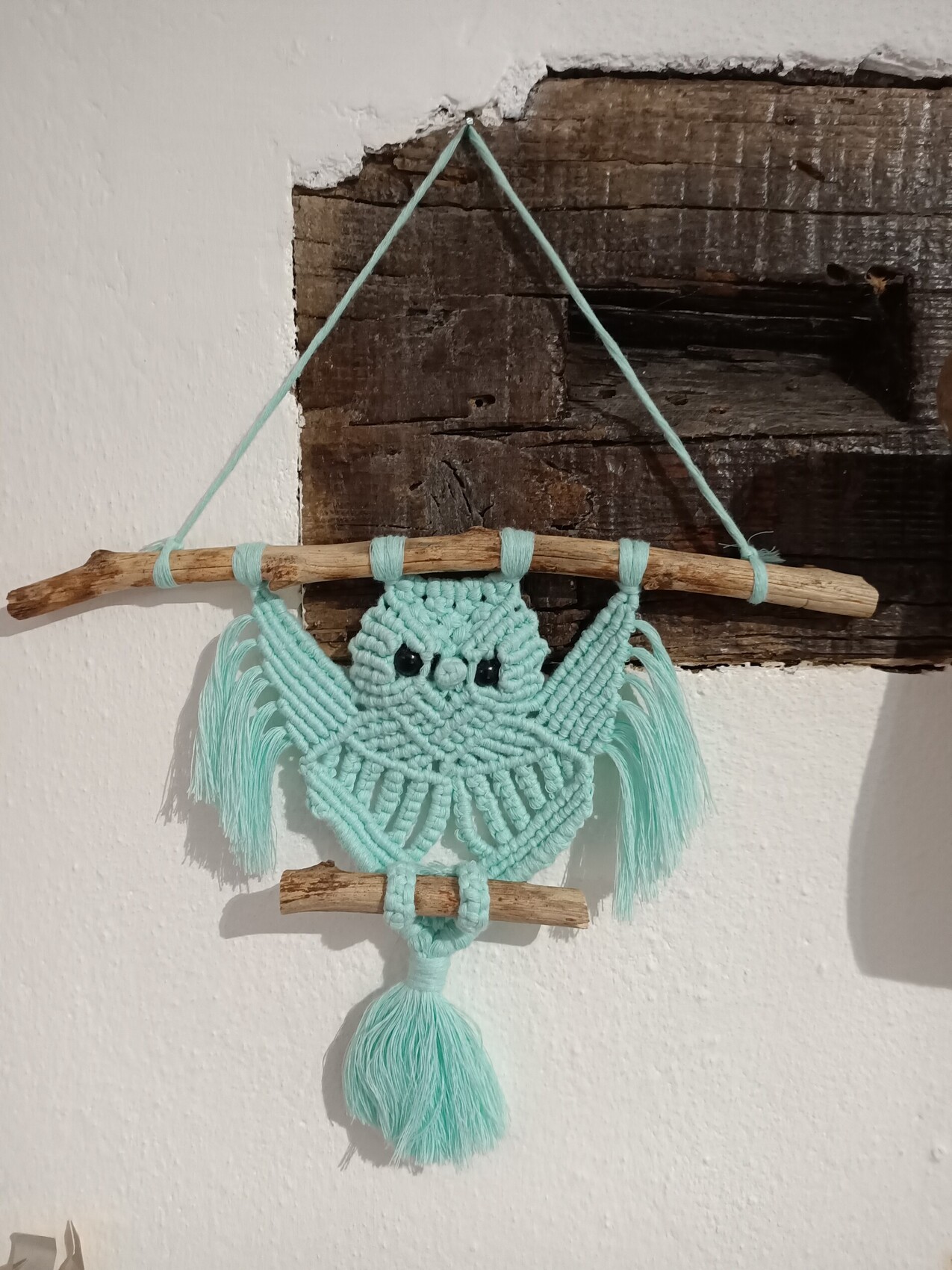 La chouette a été créée avec du fil vert d'eau 2mm et avec un support en bois fin