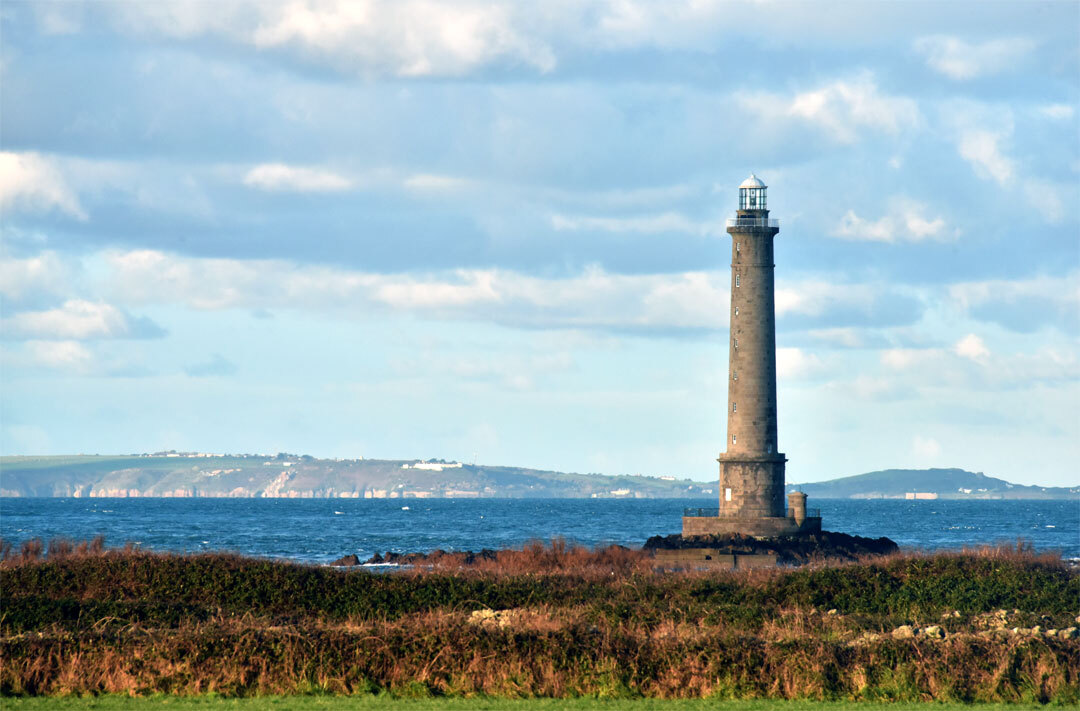 Phare de Goury le matin avec l'ile anglo-normande d'Alderney (Aurigny) en arrière plan.