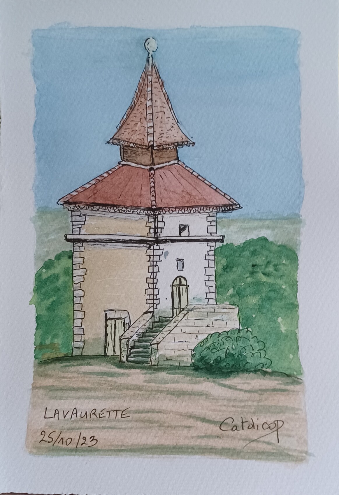 Pigeonnier a Lavaurette du côté de Montauban Aquarelle sur papier 300g de 21x 15 cm peinture extra fine de chez Sennelier Le dessin a ete fait directement au marqueur puis peint après D apres photo personnelle. Je lui trouve des imperfections mais il a le mérite d avoir été fait ; je je le referai sur un format plus grand Oct 2023