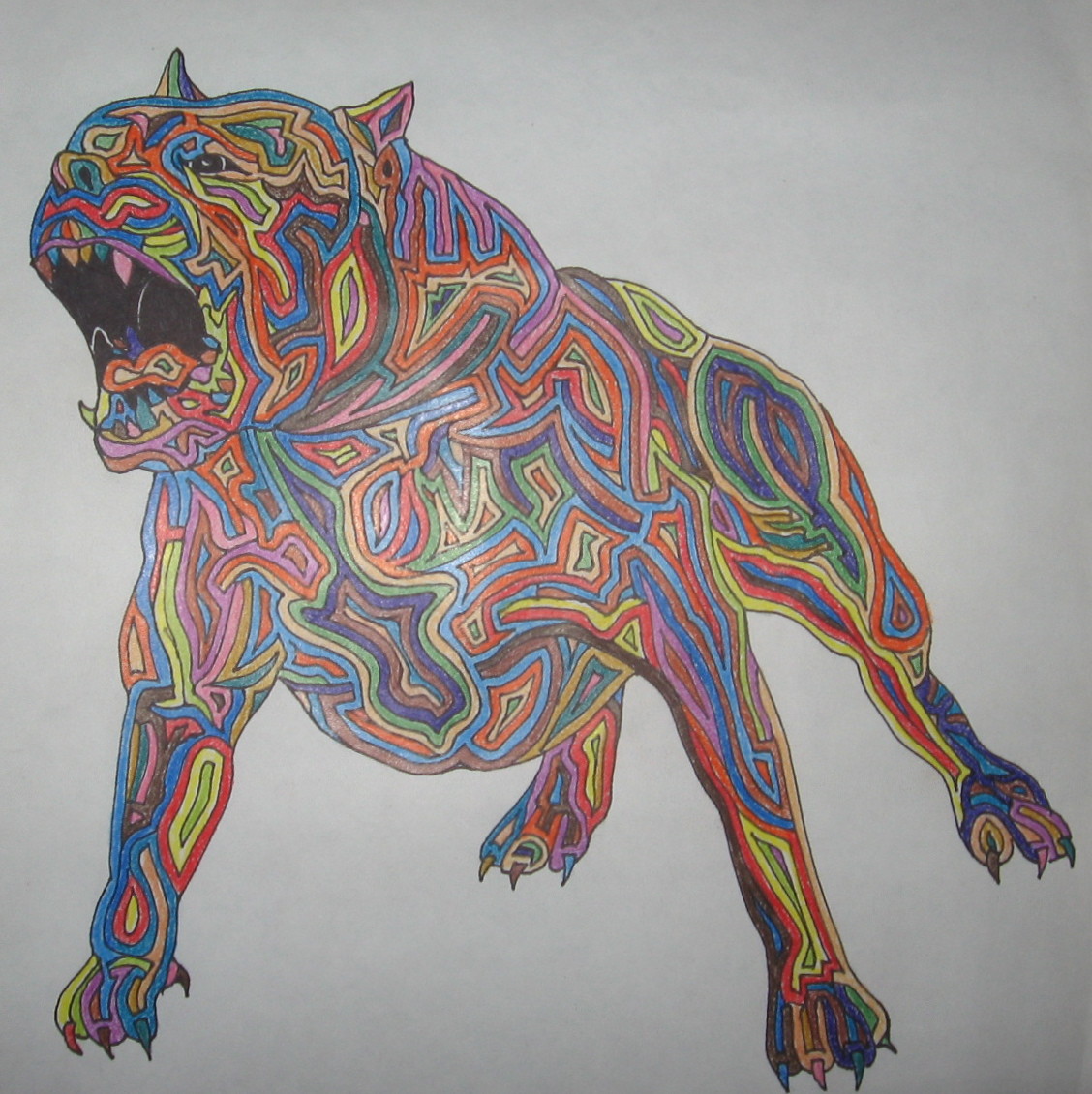 Dessin au crayon de feutre noir et crayons de couleurs.