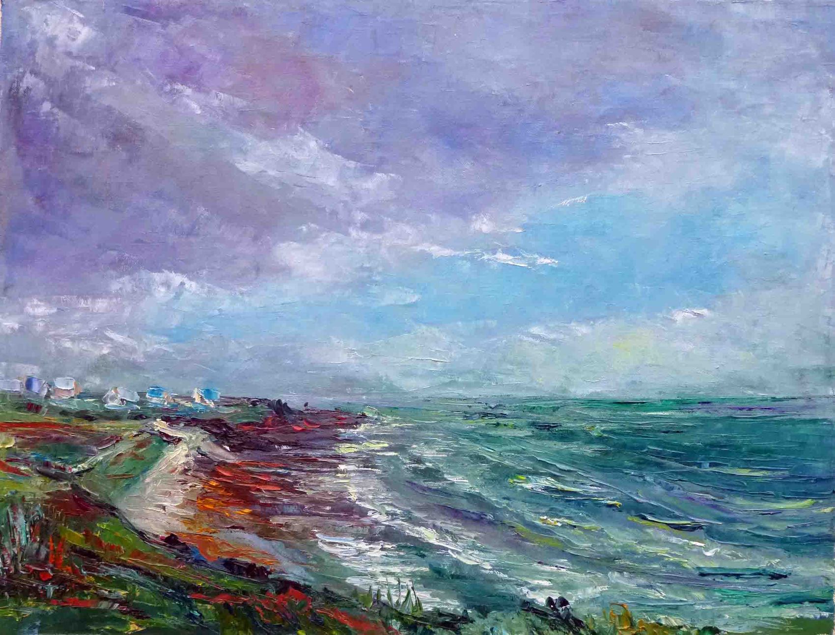 Huile sur toile travaillée au couteau, œuvre unique Baie d'Audierne 61x46 cm En baie d'Audierne à Plozevet, les vagues viennent jouer sur les rochers avant de se reposer à marée basse, laissant l'estran prendre ses bains de soleil.