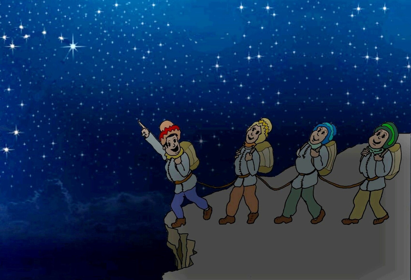 Dessin humoristique 31/31,réalisé au crayon mine de graphite pour évoquer le mot "point de repère" lors du trente et unième jour du défi d'octobre 2024 : 1 dessin par jour pendant 31 jours. L'étoile polaire indique la bonne direction mais elle ne dit pas où l'on met les pieds...