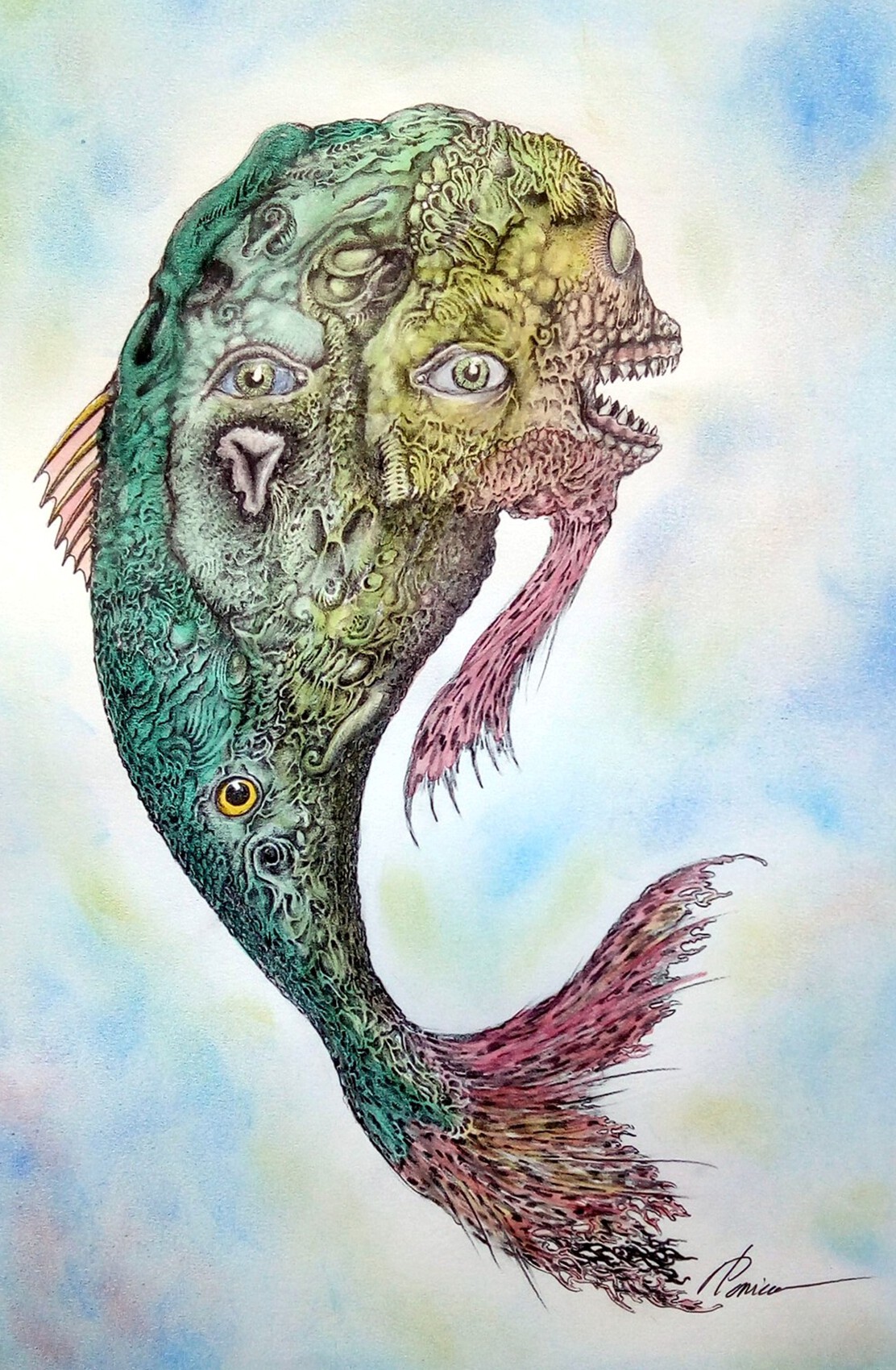 Dessin au crayon mine de graphite sur papier bristol. Couleurs à l'aquarelle. Dessin automatique en forme de poisson.