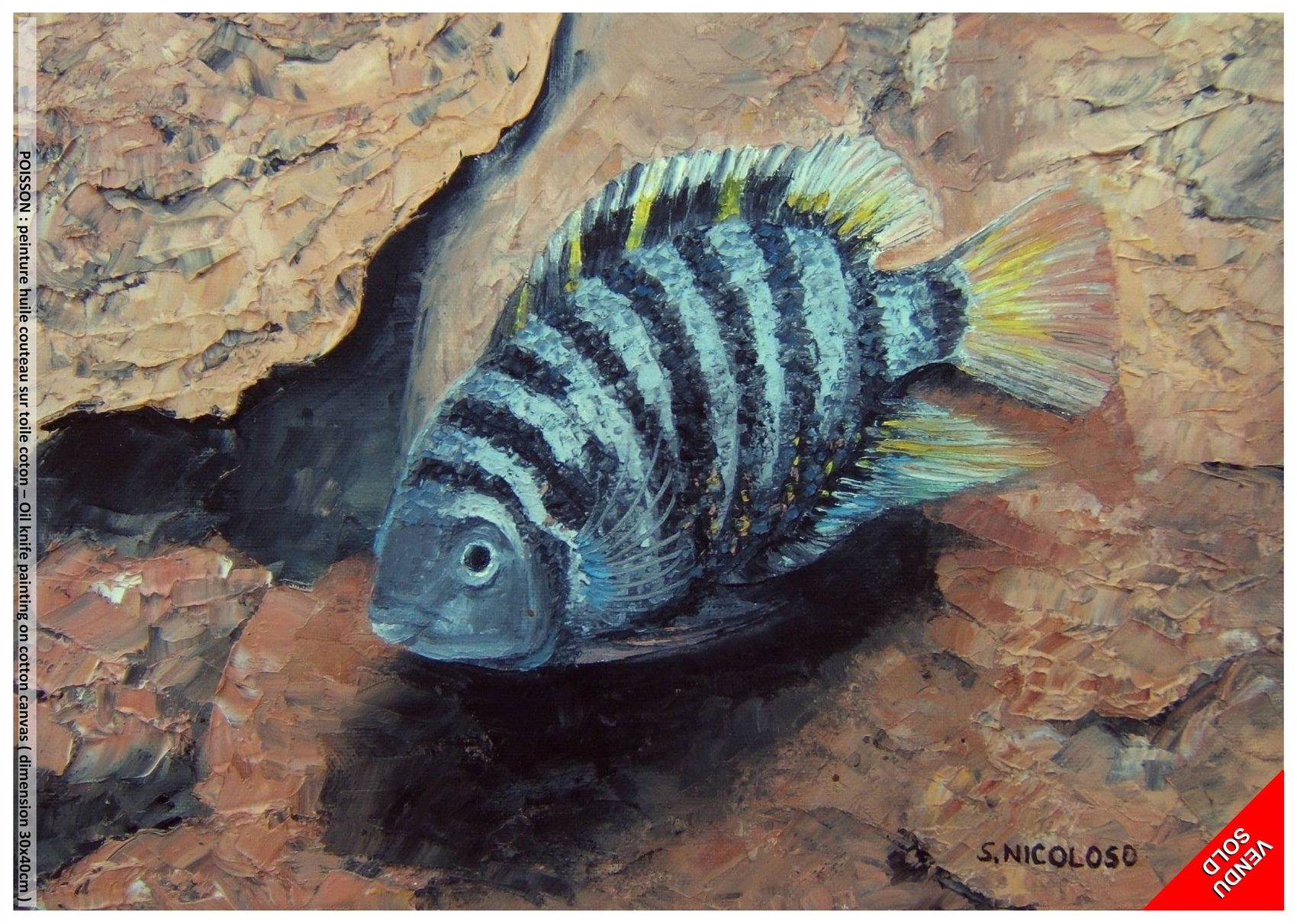 Une peinture réalisée en 2007 lors d'un salon animalier avec une association en aquariophilie, il s'agit d'une peinture huile au couteau sur châssis entoilé coton de dimension 30 x 40cm. La technique utilisée, ma préférée, est le couteau, sorte de truelle en acier souple, permet une peinture qui, par ses reliefs, accroche la lumière et apporte vie au tableau. Il suffit d’étaler de petites ou grandes surfaces de matière sur la toile pour réaliser de beaux dégradés et donner des effets de matiè