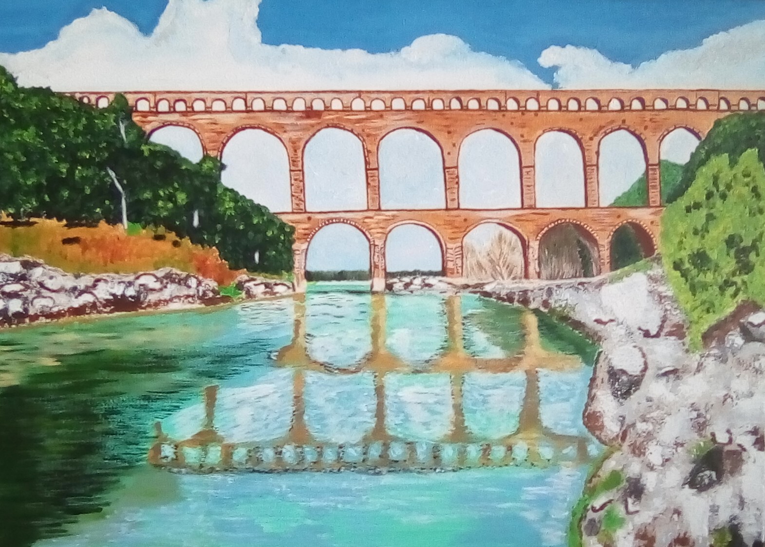 Toile 50 ×70 cm réalisée à la peinture acrylique, peint en août 2020, représentant le pont du gard