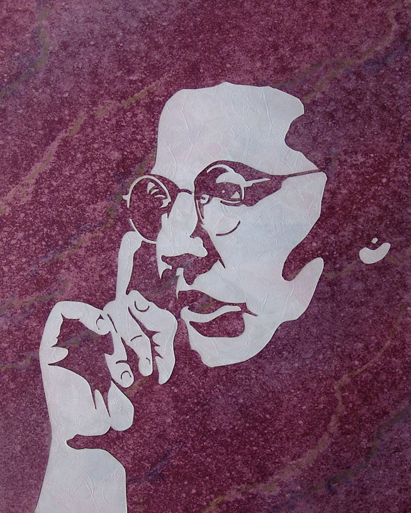 Tableau portrait de Coluche réalisé avec un papier blanc brillant avec effet incrusté dans un fond rouge mat moucheté. Technique d'incrustation de papiers sans sur-épaisseur.