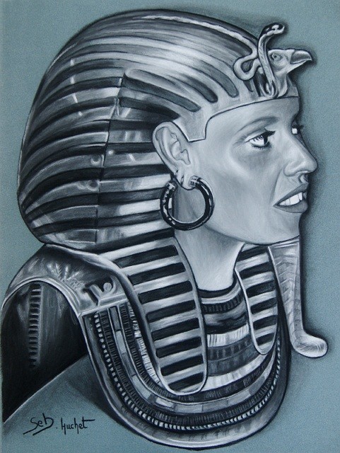 Portrait profil d'une femme portant le masque de Toutankhamon. Type: fusain sur feuille pastel card. Dimension : 30x40 cm