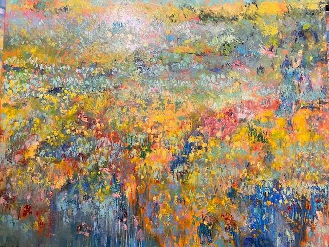 Travail au couteau avec de l'huile Superposition de touche de couleurs produisant une vitalité chromatique avec une sensation de chaleur.Cette toile transporte et nous fait rentrer dans un espace champètre rayonnant sous le soeil Dimension 100x100