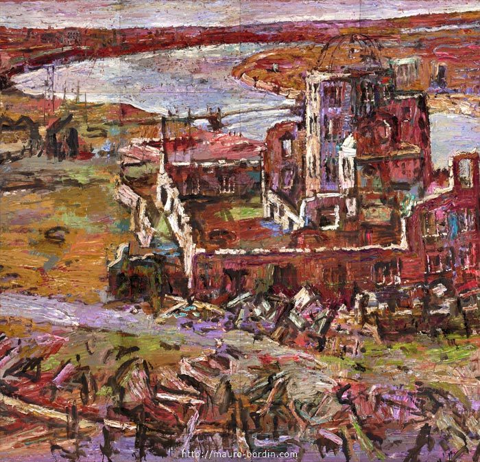 Projet Hiroshima 2001-03, Art: Hiroshima, 6 août 1945, après la bombe atomique, interprété par Mauro Bordin, peintre italien, une peinture monumentale de 30mx2,5m, huile sur papier, exposition au Padiglione Cornaro, Padoue, Italie. http://hiroshima-bordin.fr