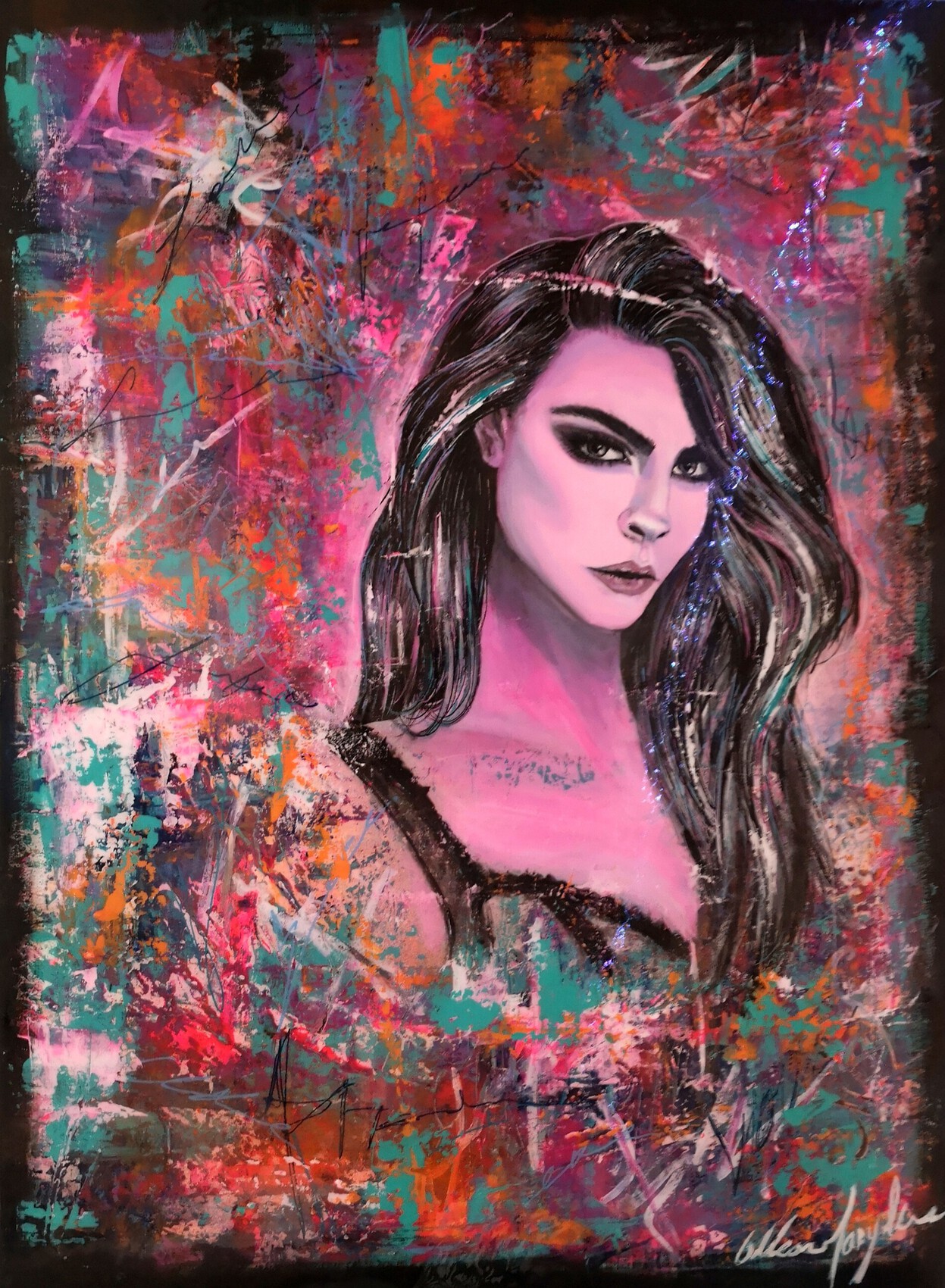 Toile en lin Dimensions:60cm/96cm Style portrait/abstrait Modèle :caradelevingne Techniques mixtes:acrylique,bombes,pinceaux,couteaux Finition résine