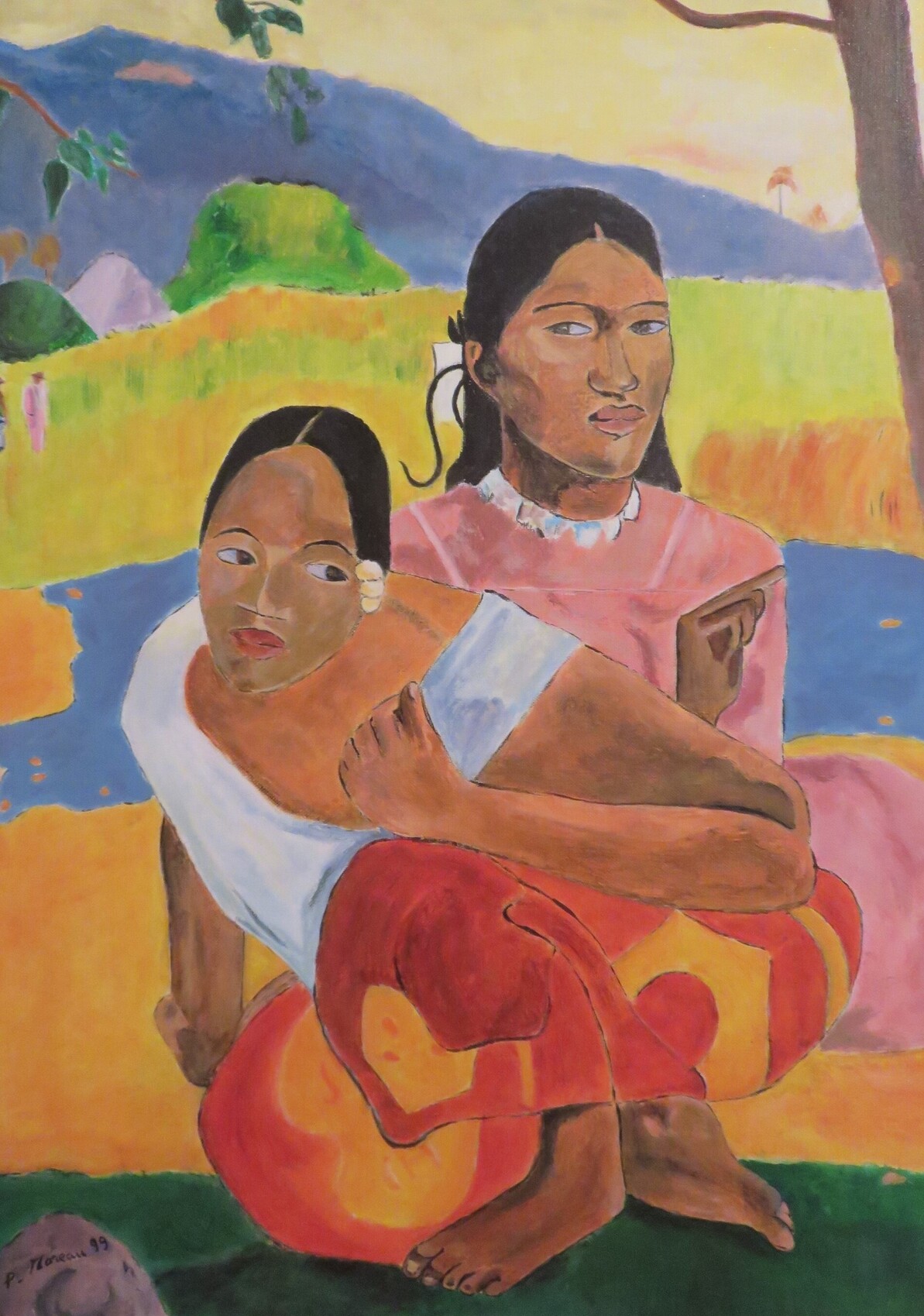 Acrylique sur carton toilé 1999 55x46cm La fleur portée par la femme du premier plan indique qu'elle cherche un mari. L'autre porte la robe de la mission, est bouddhique et signifie l'enseignement. "Le public veut comprendre et apprendre en un seul jour, une minute, ce que l'artiste a mis des années à comprendre." Paul Gauguin
