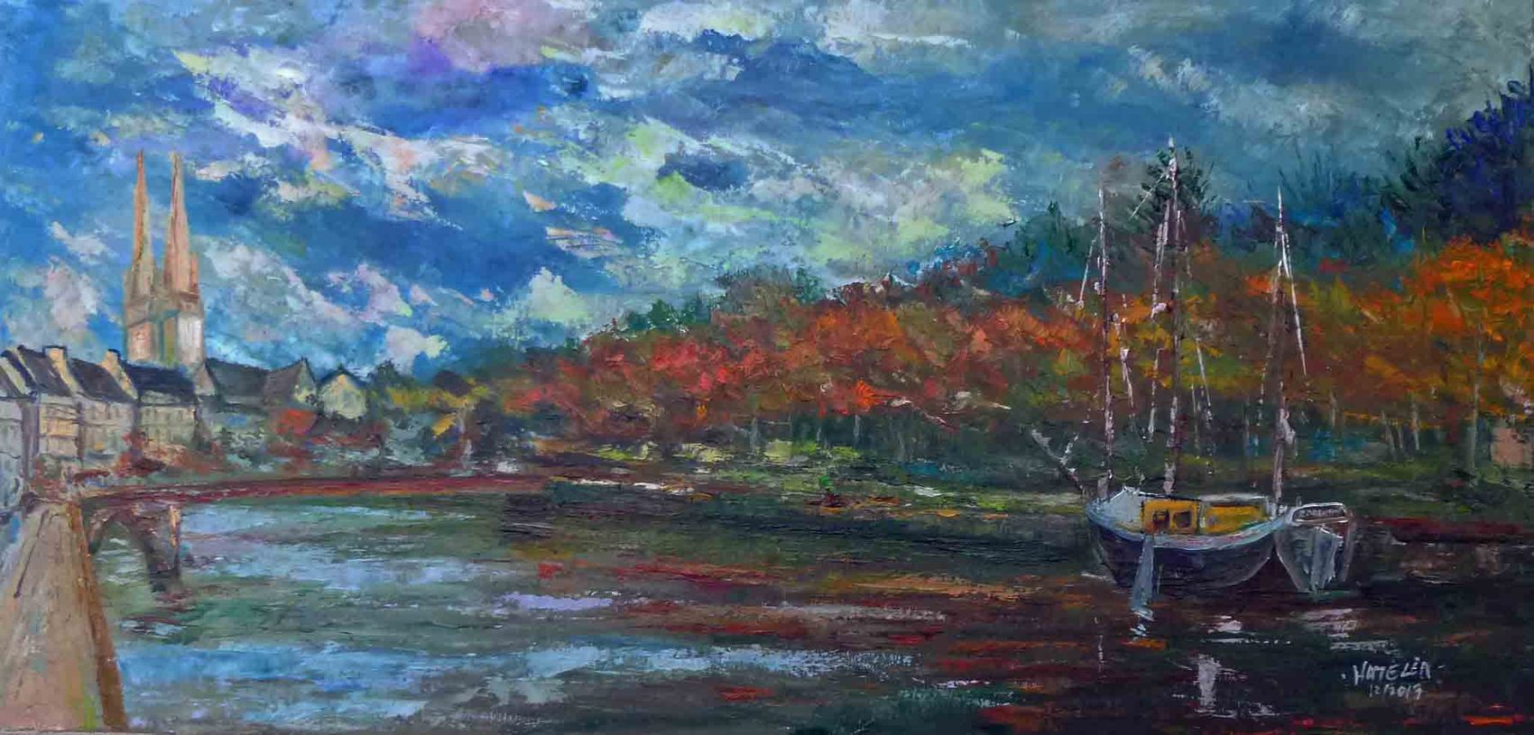 Huile sur toile travaillée au couteau, œuvre unique.40x80 cm L'automne est arrivé sur Quimper, fière la cathédrale St Corentin veille sur l'Odet qui paresse à Locmaria. Le Corentin attend le printemps pour repartir chevaucher les vagues.