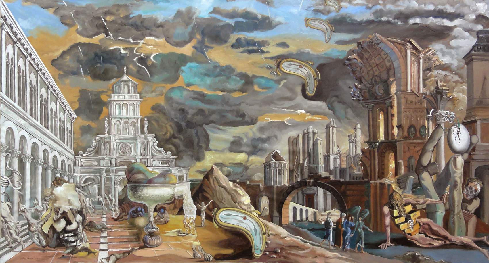 HST 105x195 cm, 2018, Cette composition synchronistique met en résonnance Dali, Tintoret, et Desiderio. Elle peut être interprétée comme une sorte de psychanalyse picturale de l’espace-temps. L’impression de ramollissement irrémédiable de l’espace et du temps est ressentie en particulier quand on pense à notre propre mort, et qu’on se persuade que toutes les montres vont alors s’arrêter pour indiquer de façon obsessionnelle l’heure exacte de notre disparition.