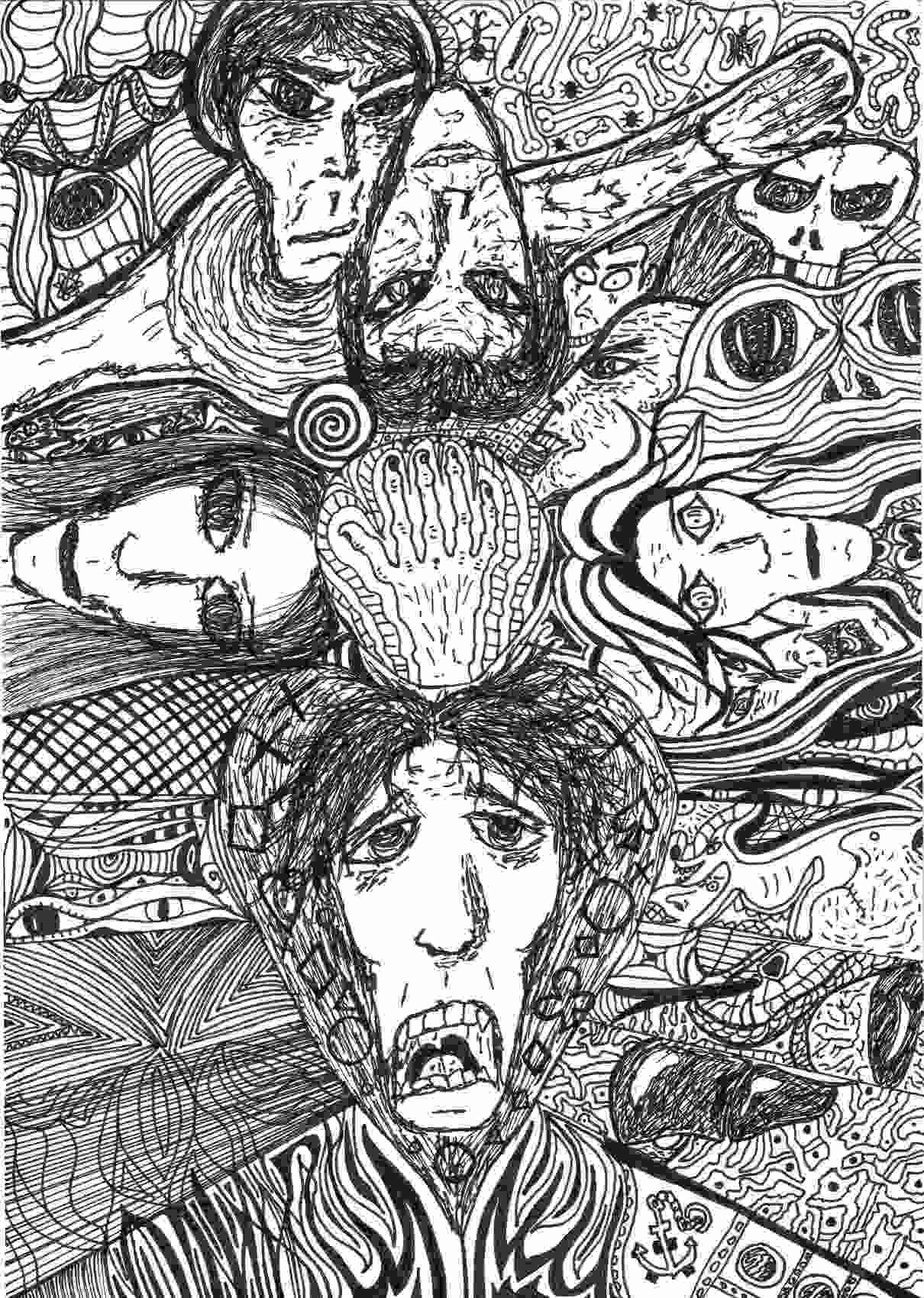 Dessin au feutre sur une feuille A4, Au menu: des têtes, une main, des insectes, des os, des vers, des fleurs, un cosmonaute, un coyote, des yeux, un crapaud, une tête de mort, un foie, un bateau, des flammes, des ronds, des croix, des trèfles, des piques, des coeurs, des carreaux, une gueule de serpent, un punk...