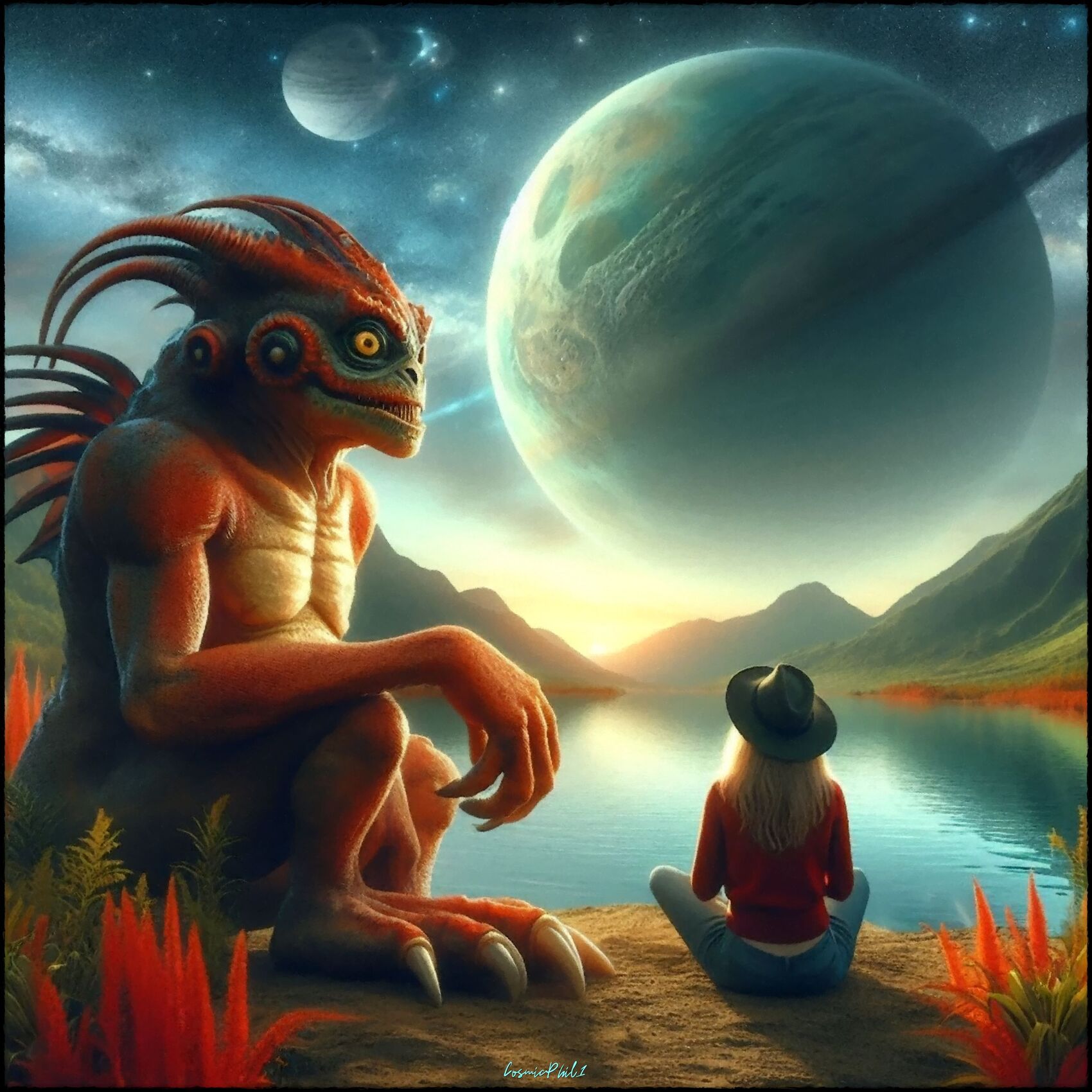 Une femme, seule, assise au bord d'un lac sur une exoplanète, rencontre un monstre ... gentil ? Est-ce le Paradis ?