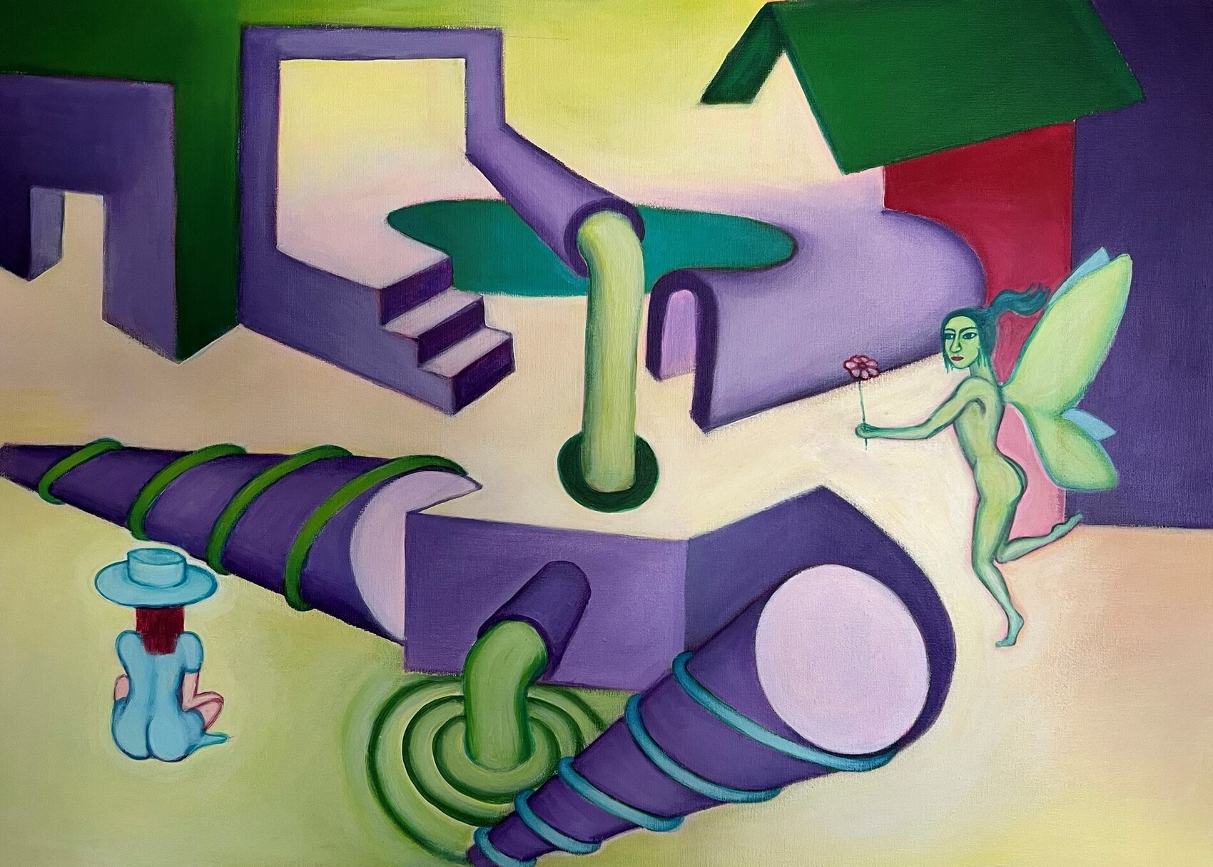 La rencontre est imminente. La femme habillée d'un chapeau attend, contemplative. La créature féérique dotée d'une fleur à offrir vole vers son rendez-vous. Technique : Peinture (Acrylique) Année de réalisation : 2023 Hauteur : 70 cm Largeur : 50 cm Épaisseur : 1.5 cm