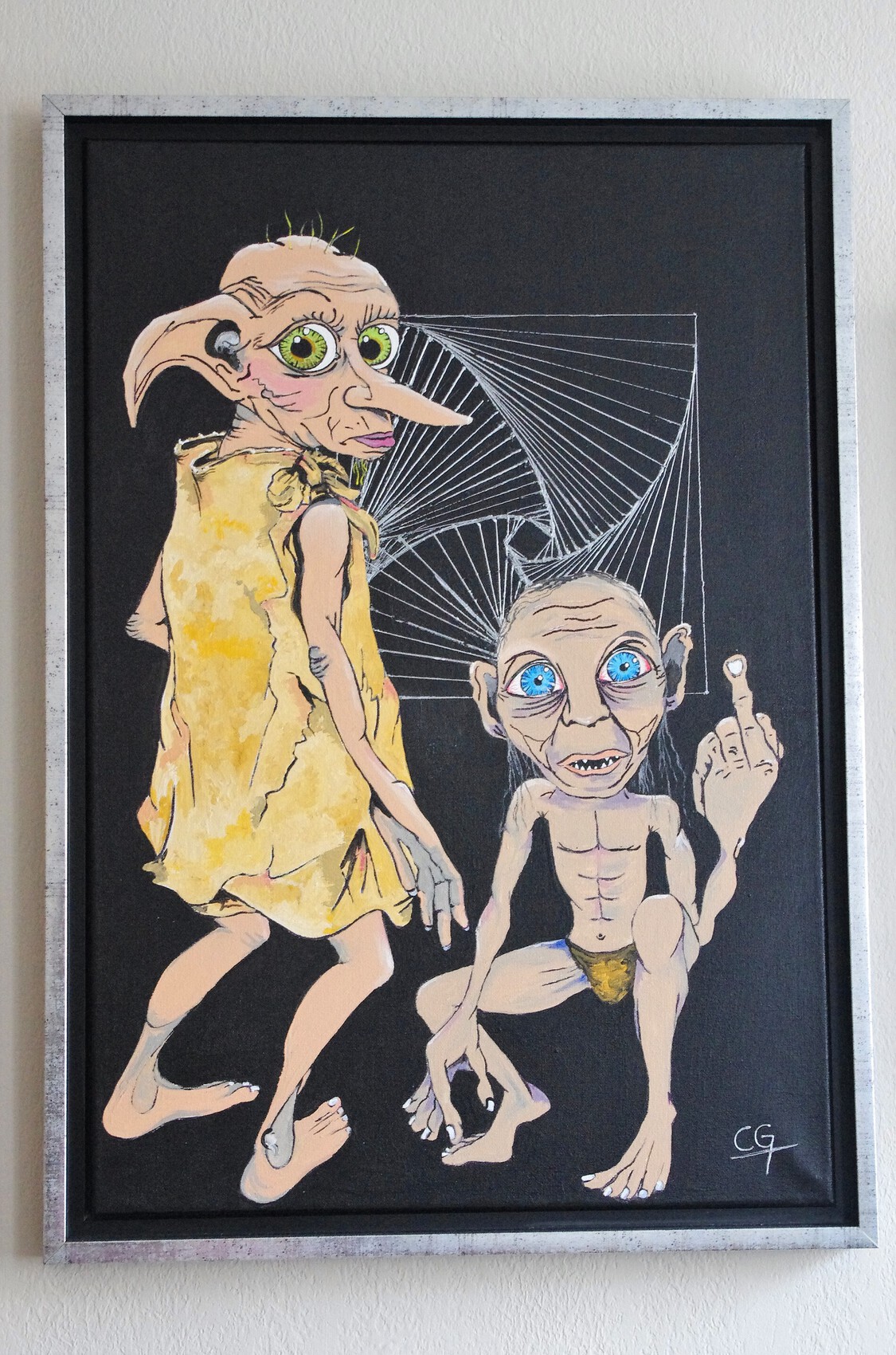 peinture acrylique : Rencontre Dobby/Gollum dimension de la toile : 50x73cm