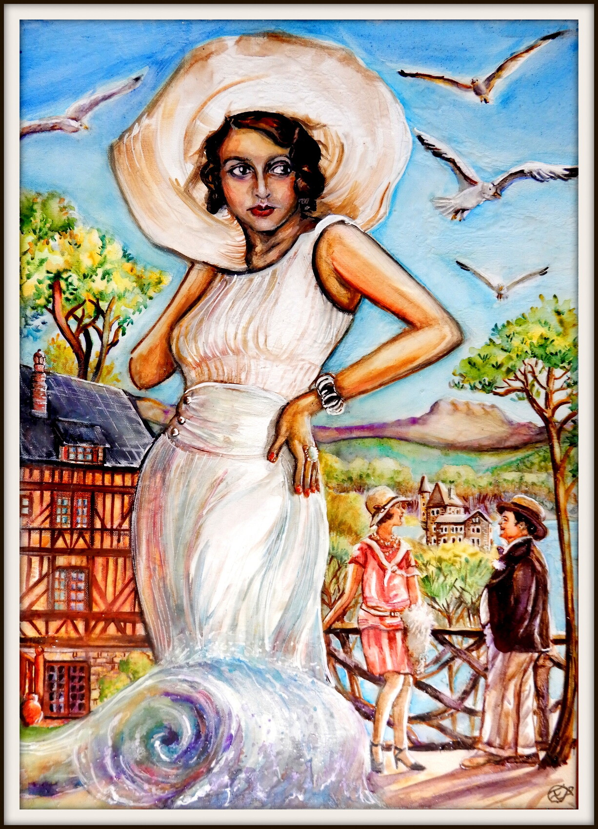 Mon tableau de concours pour "Pinceaux d'Automne" à Salies de Béarn. Aquarelle intense, galets graphites, feutres aquarelles. (50x70cms). Evocation de la mannequin Renée Perle, égérie des grands couturiers et muse de Jacques Henri Lartigue.