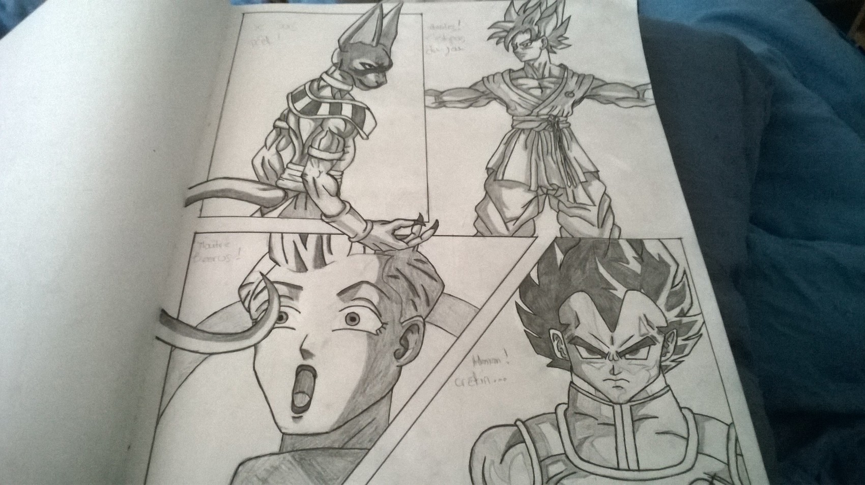 Planche BD. Ceci est une planche non fini que j'avais faite il y a a peu près 1 ans, je n'y est pas toucher depuis...j'ai plus le gout au dessin et ça m'attriste, c'est pourtant une passion je voulais tellement en faire un métier malheureusement pour le moment ce n'est pas le cas, je vous montre cette planche car elle me fais du bien quand je la regarde alors je vous la partage. Je dessine souvent des personnages, surtout du DBZ, DBZ depuis que je suis gamine m'a souvent "sauvé la vie" psycholog