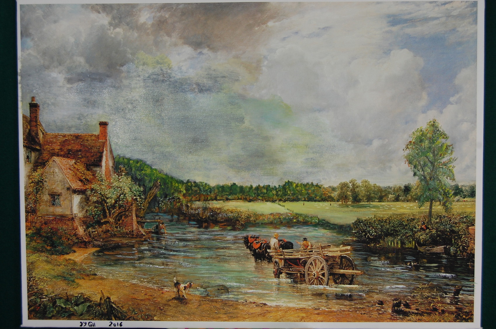 Je trouve que la version du tableau original (celui le plus connu) de Constable est bien représentative de l'ambiance de la peinture romantique du 19ème siècle anglais, mais que le tableau n'est pas équilibré par lui-même. Alors j'ai repris une copie que j'ai modifiée pour l'exposer dans ma salle à manger. Sacrilège dites-vous?