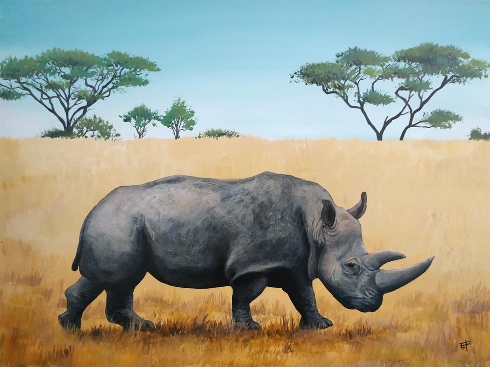 Peinture d'un Rhinocéros Blanc dans la savane. Styles: figuratif réaliste. Technique: peinture acrylique vernis sur panneau bois MDF. Dimensions: 40 x 30 x 0.3 cm http://sabistar-creations.blogspot.com