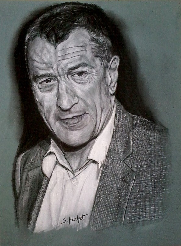 Portrait de l'acteur Robert De Niro Type : pierre noir sur feuille pastel card bleu Dimension : 30x40 cm