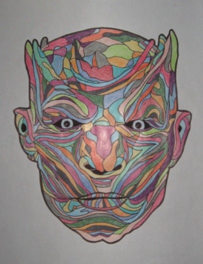 Dessin au crayon de feutre noir et crayons de couleurs.