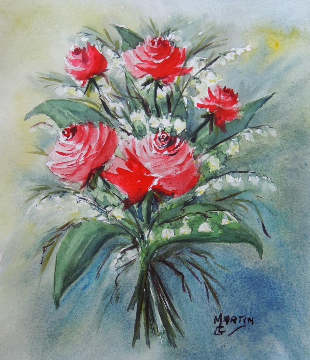 Roses d'un rouge ardent et muguet à la senteur délicate pour une très belle et douce aquarelle