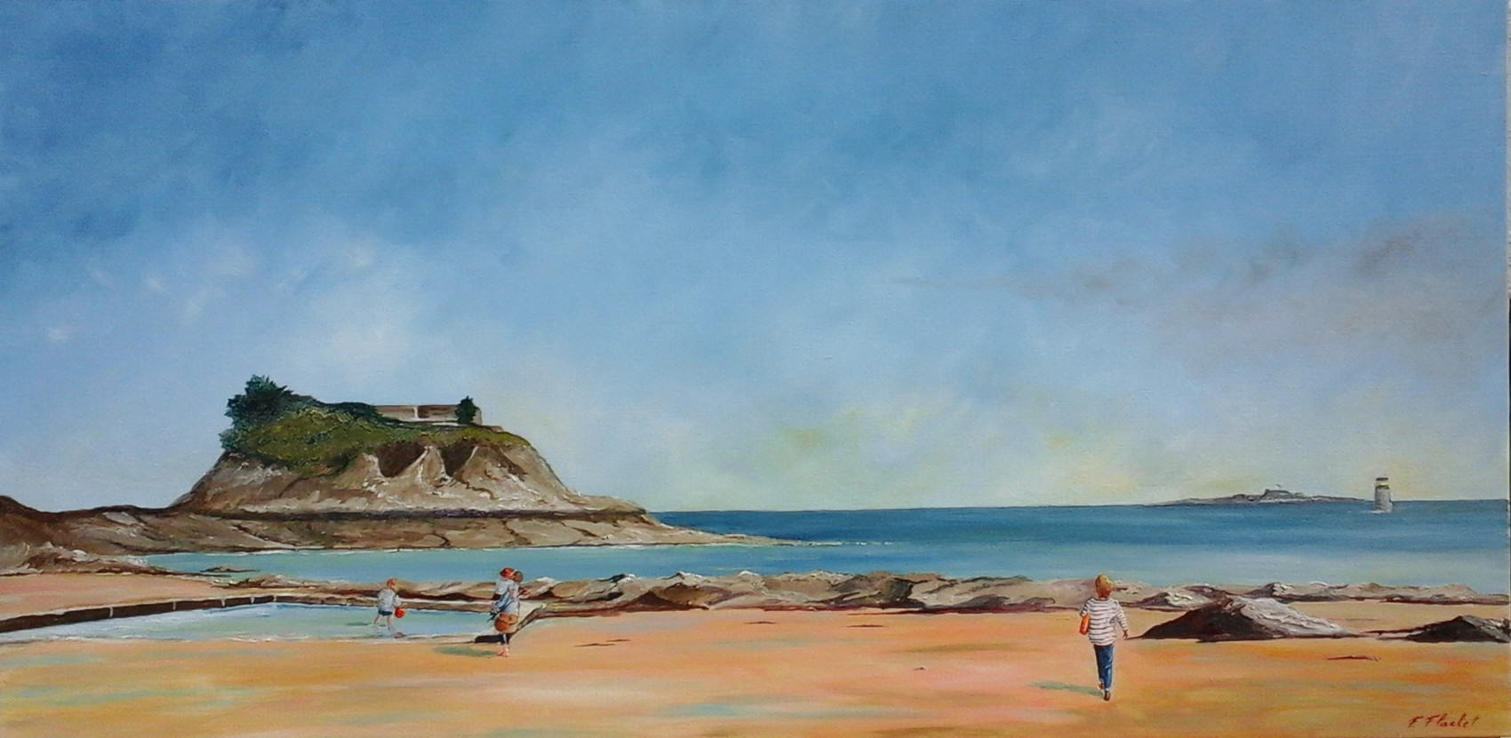 Huile sur toile 100x50 Plage de la Comtesse à St Quay Portrieux. Mer basse, 4 personnages