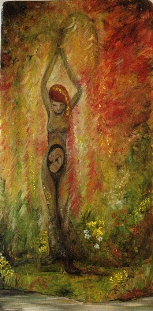 Huile sur bois. 20 x 40 cm. Oeuvre originale et signée Un saule pleureur anthropomorphe laisse entrevoir sur son tronc une cavité où se love un bébé mi-homme-mi bois.