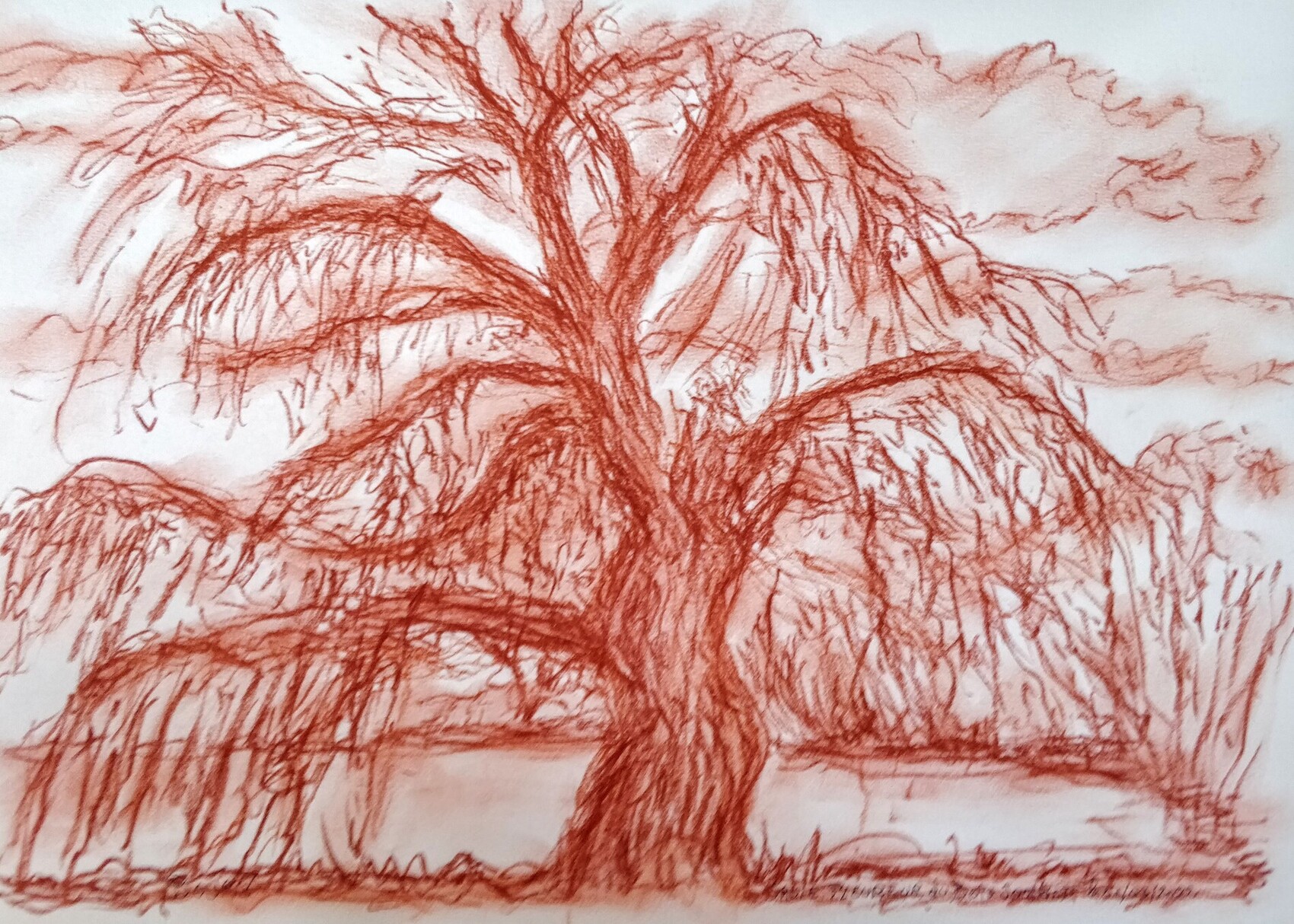 Sanguine sur papier, saule pleureur de l'étang du bois Joalland en Bretagne.