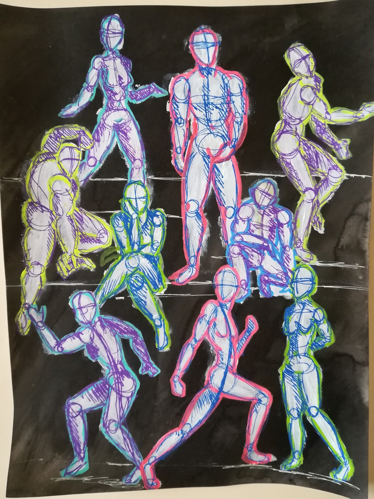 Dessin sur feuille Canson. J'ai d'abord peint la feuille à l'encre de Chine. Après j'ai vaguement tracé les formes de mes personnages avec de l'acrylique blanche. Ensuite j'ai d'abord tracé les contours principaux des silhouettes avec des poscas épais puis les traits des croquis avec des poscas plus fins .