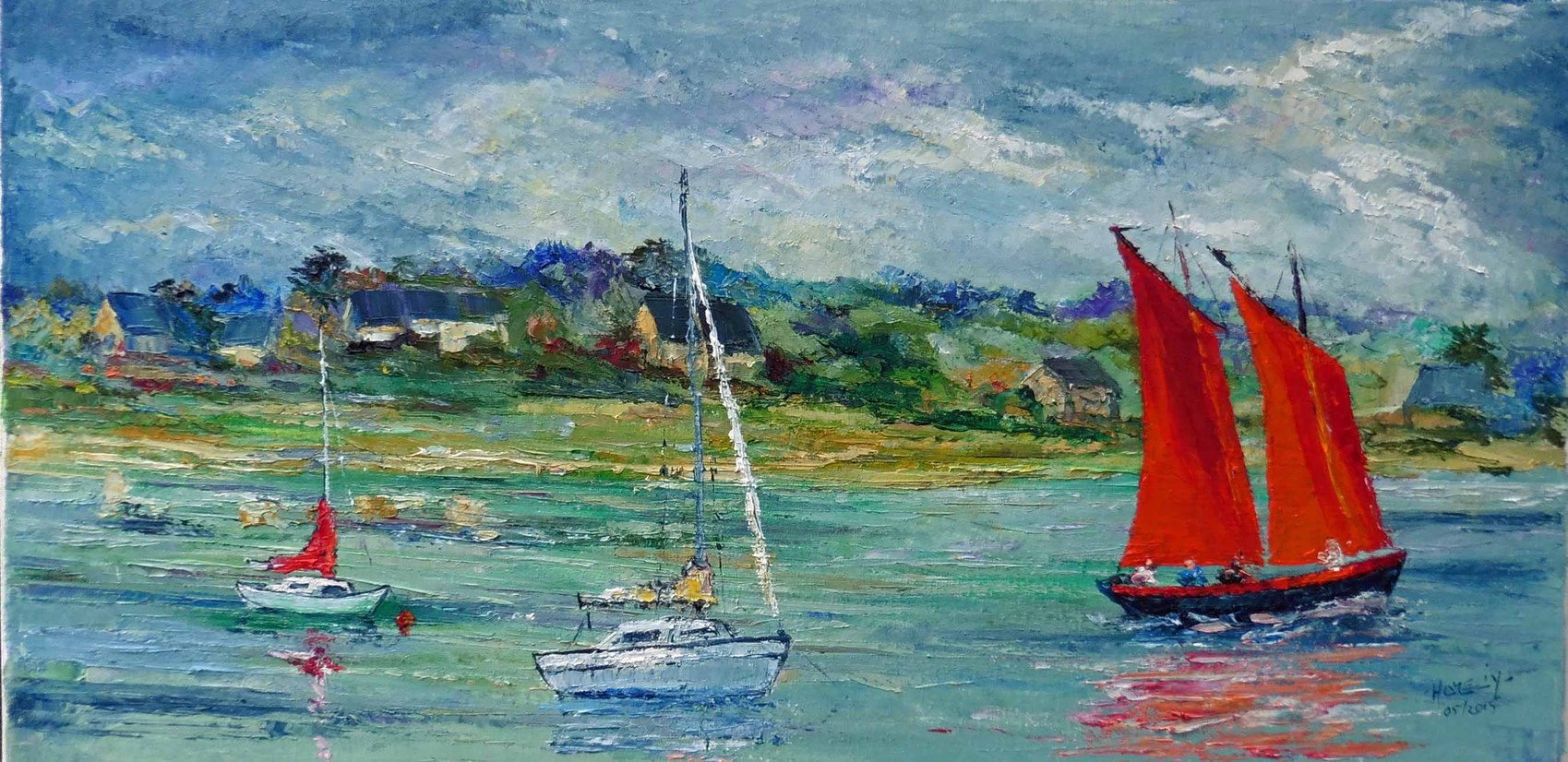 Huile sur toile travaillée au couteau, œuvre unique 40x80 cm. Dans le golfe du Morbihan, un sinago slalom entre les voilier s, étendant sa voile rouge dans un ciel encombré. Disponible