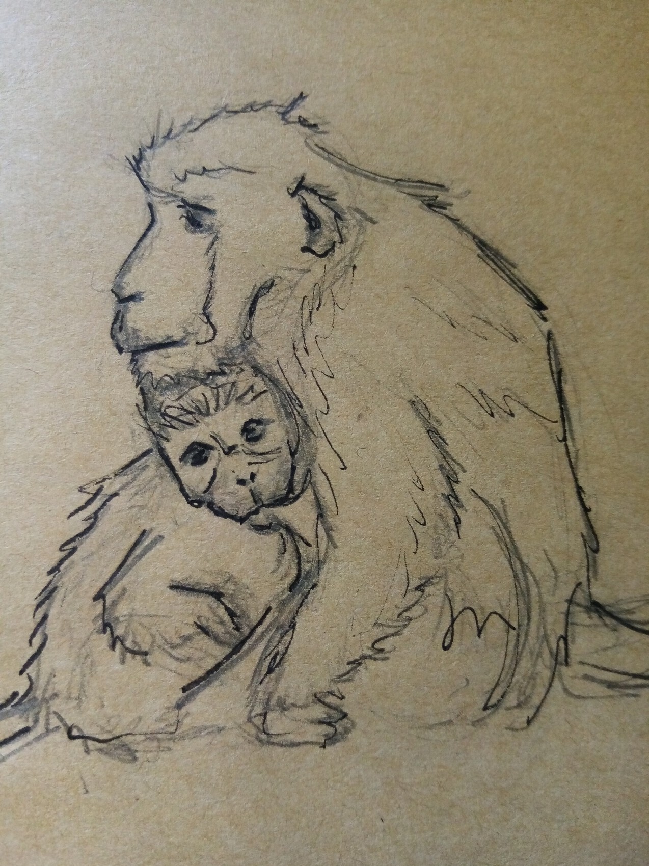 Esquisse d'une maman singe pas peureuse et de son adorable petit. Leur comportement très humain, rappelle fortement celui d'une maman humaine et de son bébé. Frappant. C'était aux temple d'Angkor (Cambodge).