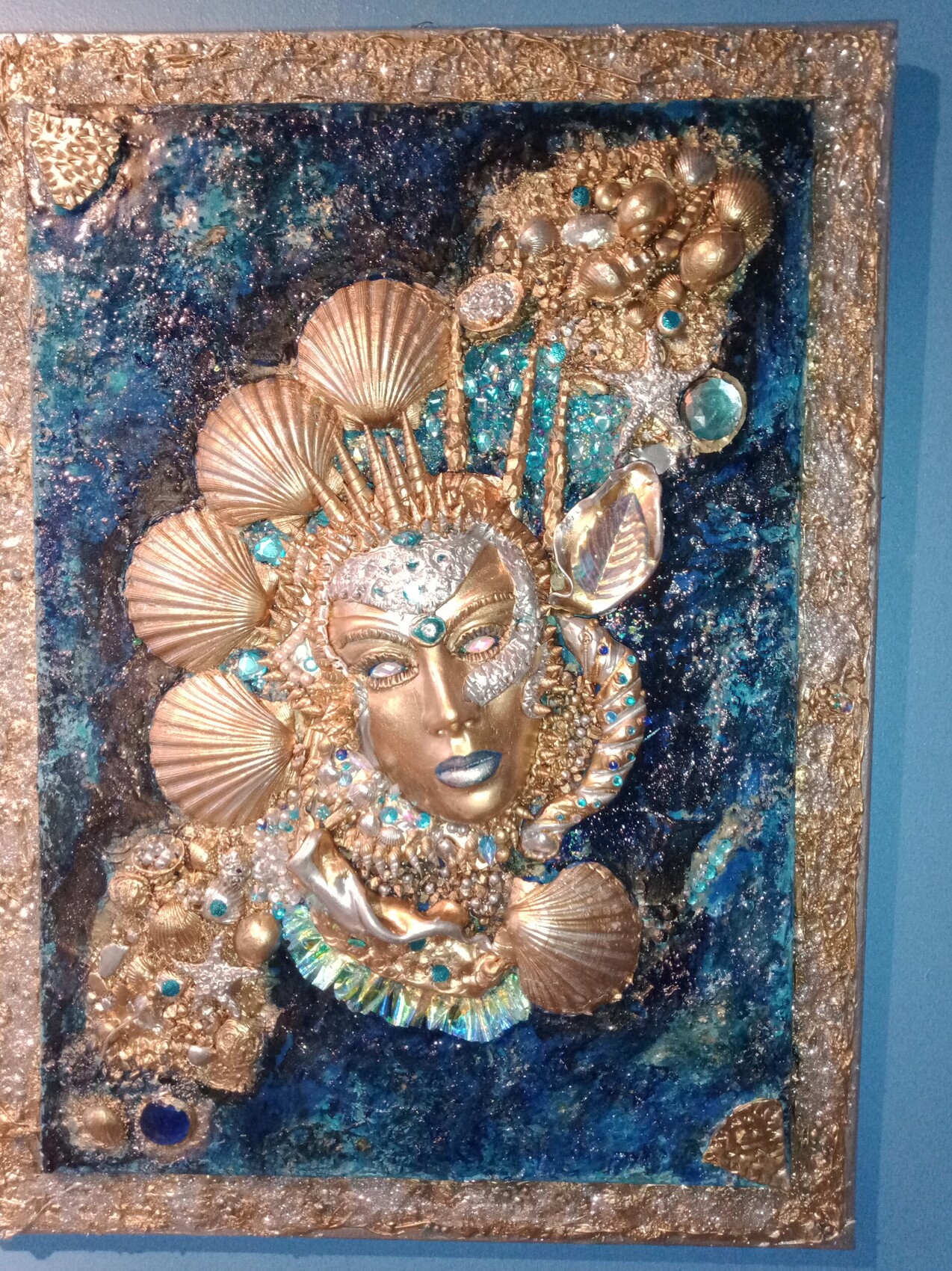 tableau décoratif sirène coquillage masque orné de pierres turquoise or ect!! , fond couleur océan vernis en résine