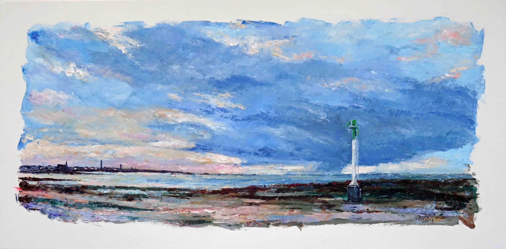 Huile sur toile travaillée au couteau de 100x50 cm œuvre unique. A la pointe de la Bretagne, le soleil se lève sur Penmarch, le phare d'Eckmühl et la chapelle tente de capturer quelques rayons avant la tempête sous l'œil vigilant d'une balise !