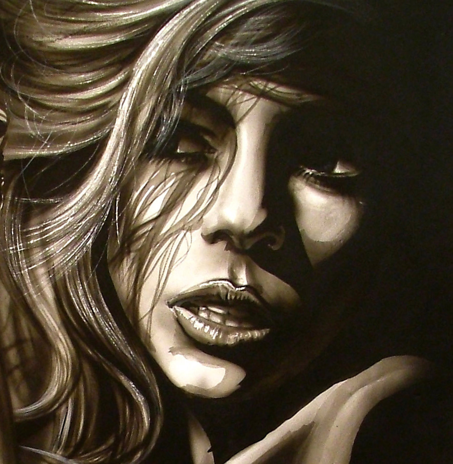 un visage énigmatique évoquant les mystères de la FEMME. (encre de chine sur papier réhaussé à l'aéro)