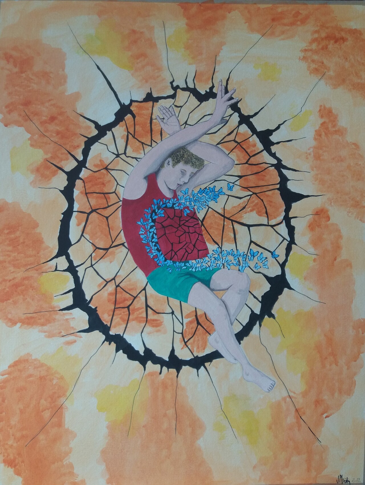 un sous un souffle est projeté en arrière et défonce le mur son ventre explose libérant des papillons bleus