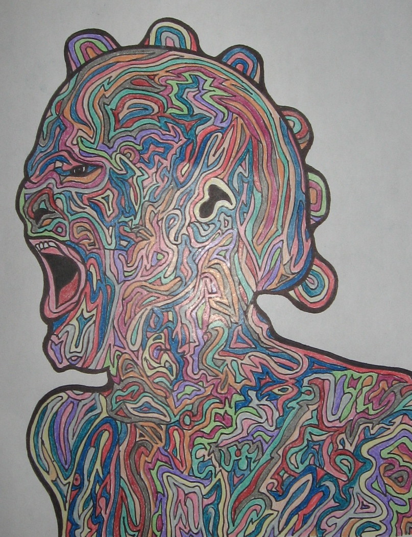 Dessin au crayon de feutre noir et crayons de couleurs.