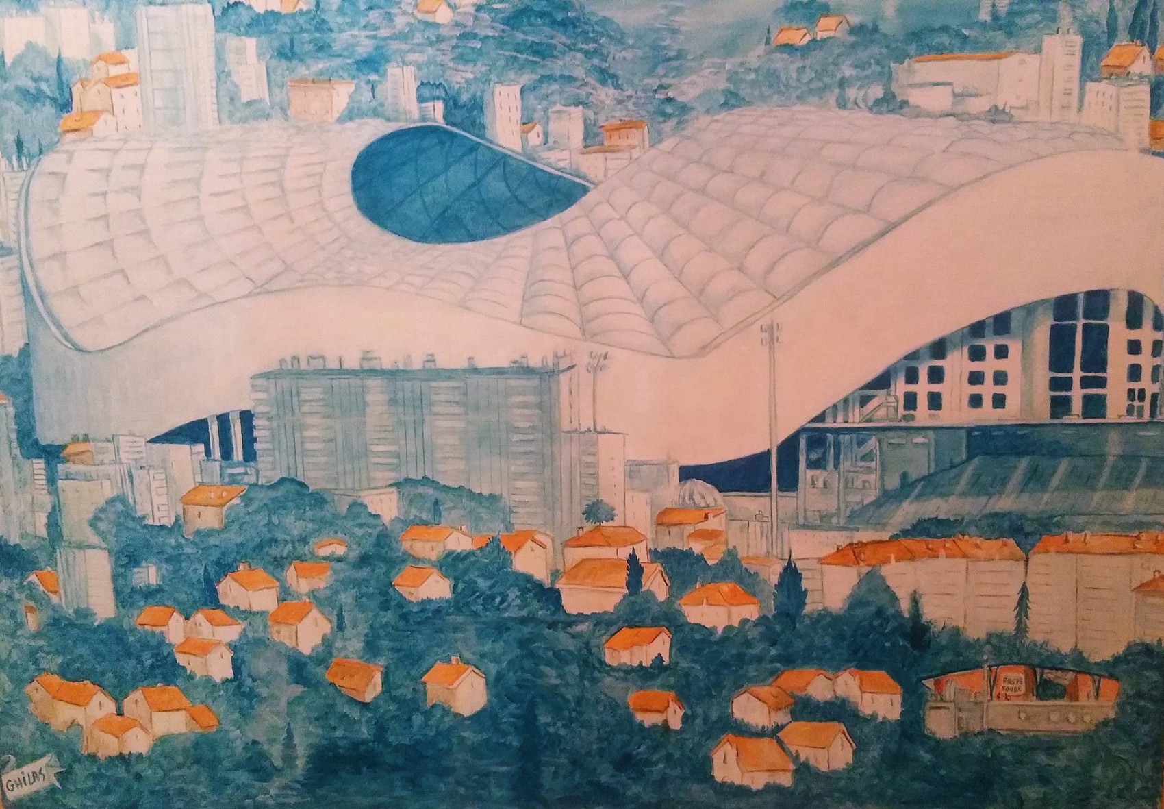 peinture a l'huile ,en camaïeu, représentant le mythique stade vélodrome! allez l'OM