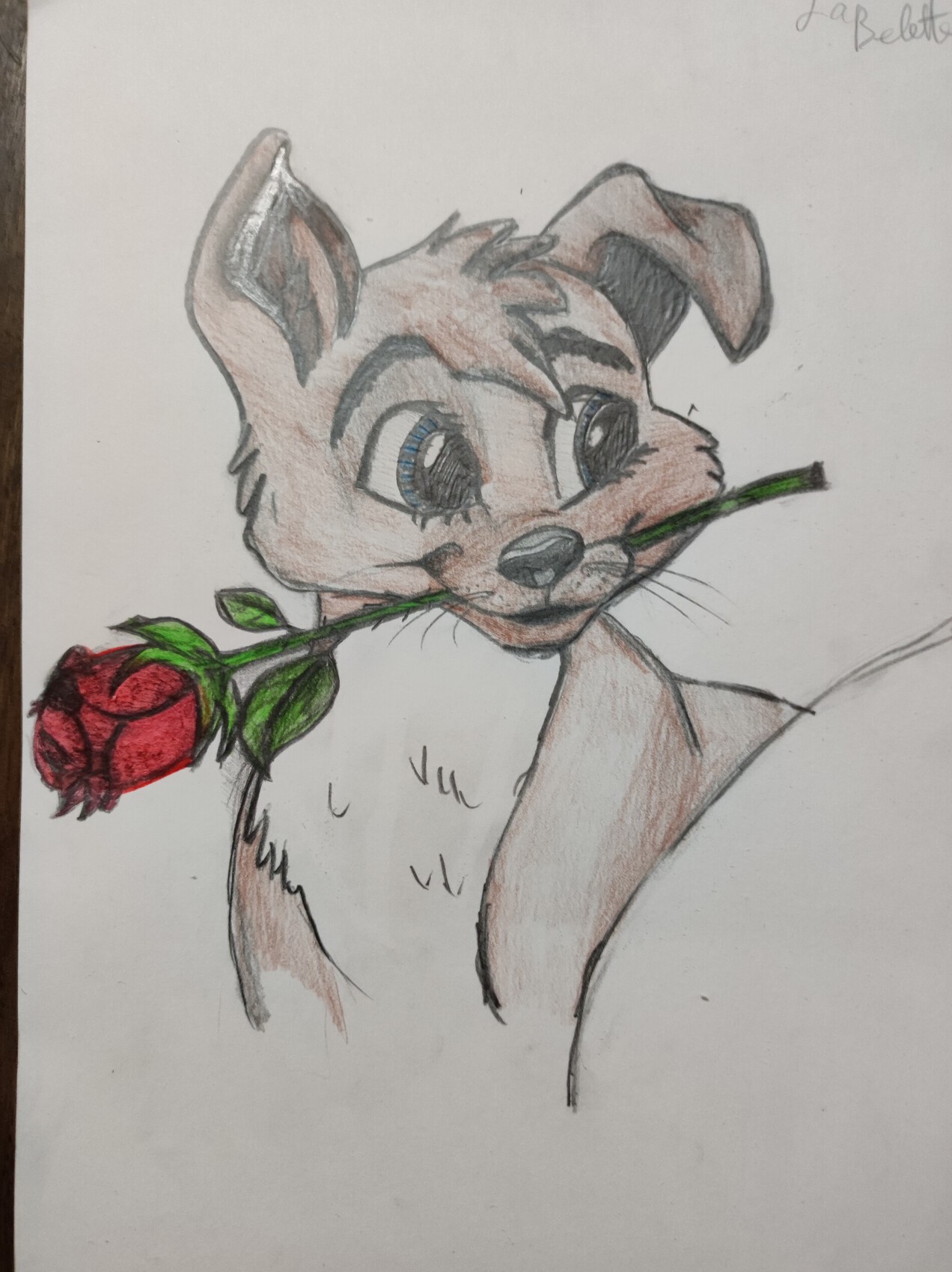 il est adorable ce petit chien au regard vif !:) attention il vase piquer le museau avec les épines de la rose !:)) il est très réussi ton cartoon ! :)